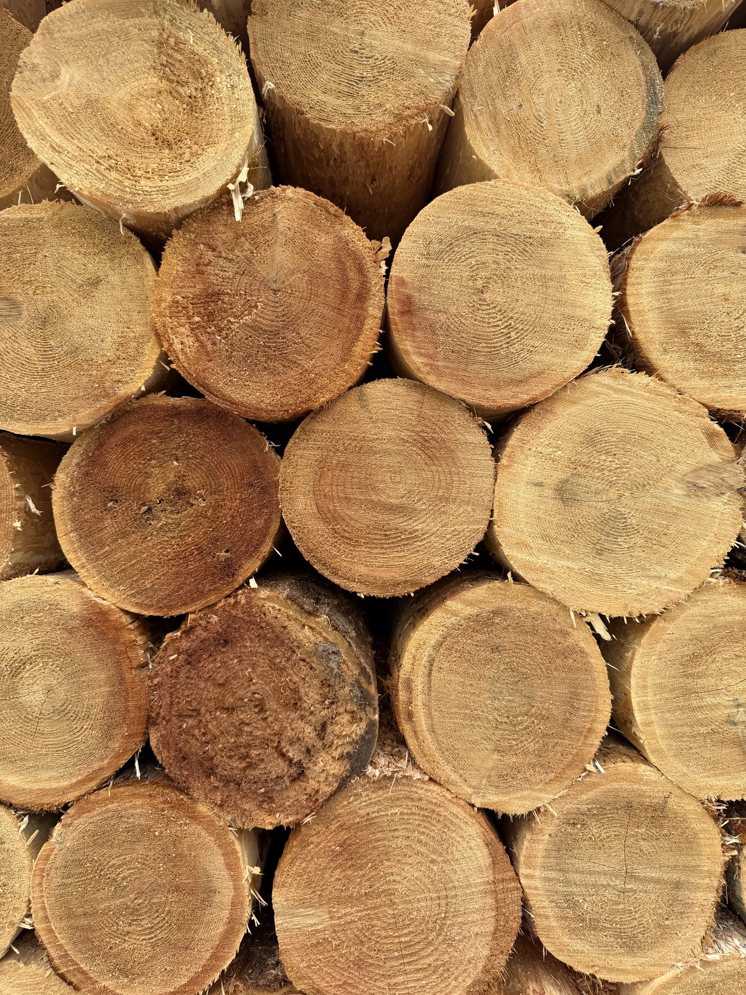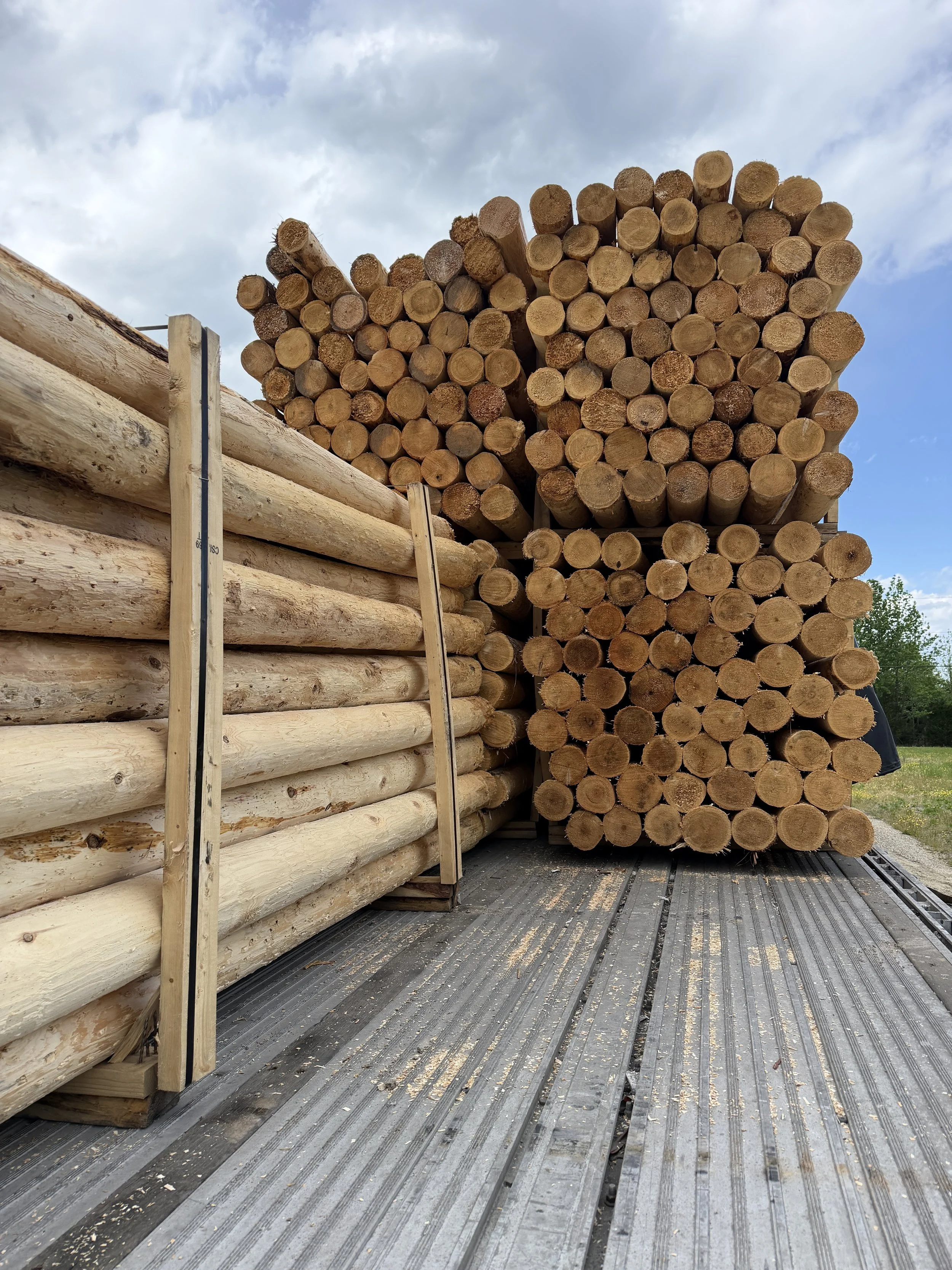 375 of them, cut from Eastern White Cedar forests in Ontario and Quebec, stacked high on a truck. Offloaded by an earnest 16-year-old learning the forklift trade, his daddy watching from the edge of the truck.